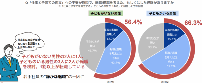 特に不安を抱えている人にはキャリア意欲の高い層も多く、また男性においては、「転職や退職を検討した」もしくは「実際に転職/退職した」人が6割に上る状況が浮き彫りとなり、性別に関係なく“両立不安”がキャリアの意欲やキャリア選択に影響する事が明らかになりました。