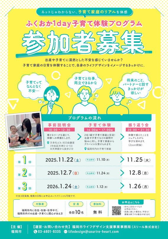 弊社スリール株式会社は、福岡市と連携し、子育て中の家庭を訪問し、結婚や出産、子育てなどのライフプランについて考える体験型プログラムである「ふくおか1day子育て体験プログラム」を2025年11月~2026年1月にかけて全3回開催します。